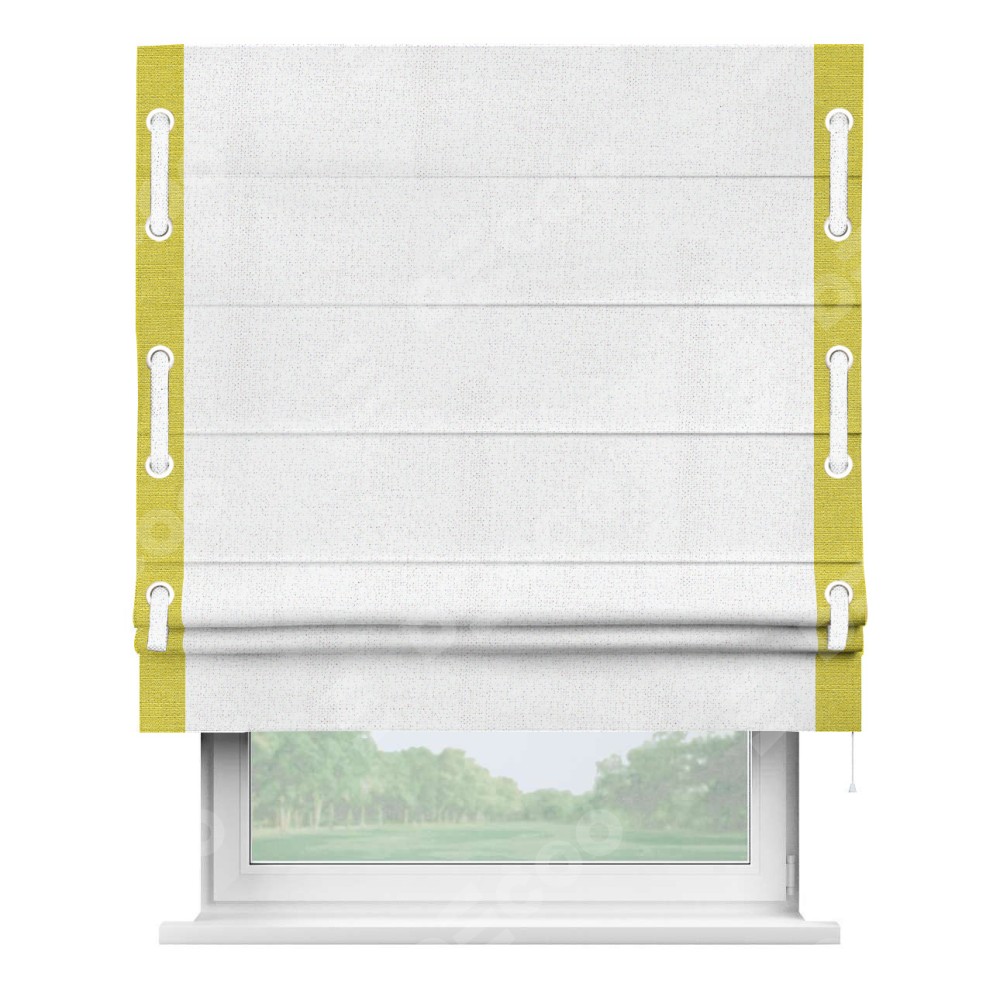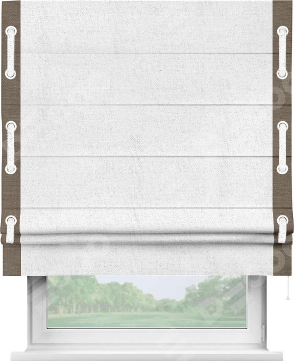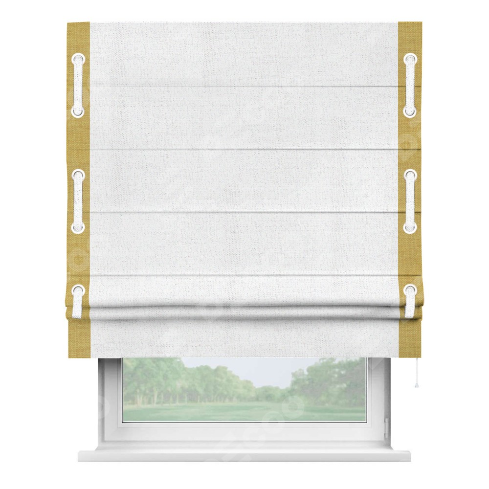 Римская штора пошита из ткани лён белоснежный, артикул: 95632, с отделкой кантом «Стрим Дуо», дополненная декоративными люверсами на этих кантах и протянутым пояском из основного цвета римской шторы, представляет собой высоко декоративное и функциональное решение для оконного оформления. Канты, расположенные по обеим боковым сторонам шторы, уже добавляют изысканности и завершенности внешнему виду. Добавление люверсов и пояска не только усиливает декоративный эффект, но и придает шторе дополнительную текстурность и глубину.