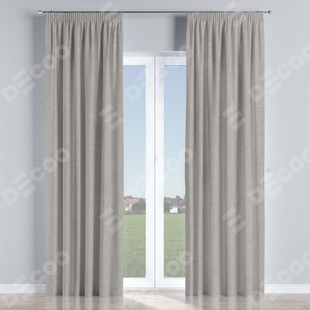 Комплект прямых штор, от производителя «Cortin», пошиты из ткани лён серый, артикул ткани 91410. С изнаночной стороны в верхней части штор пристрачивается шторная лента с декоративными складками «Карандаш». Для создания элегантных складок прямые шторы шьются по стандарту с коэффициентом 1:2 (на 100 см. ширины проёма 200 см. ширины ткани).