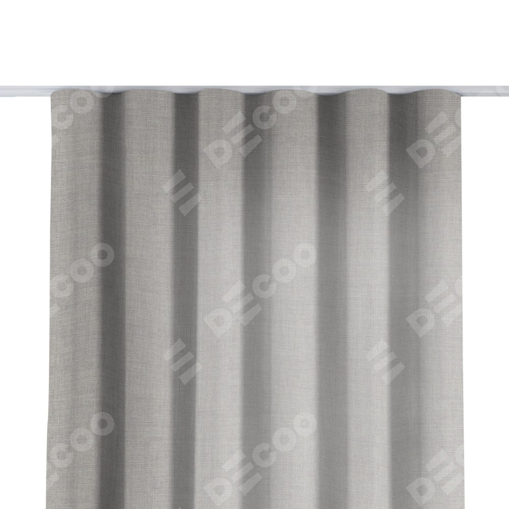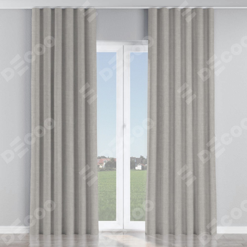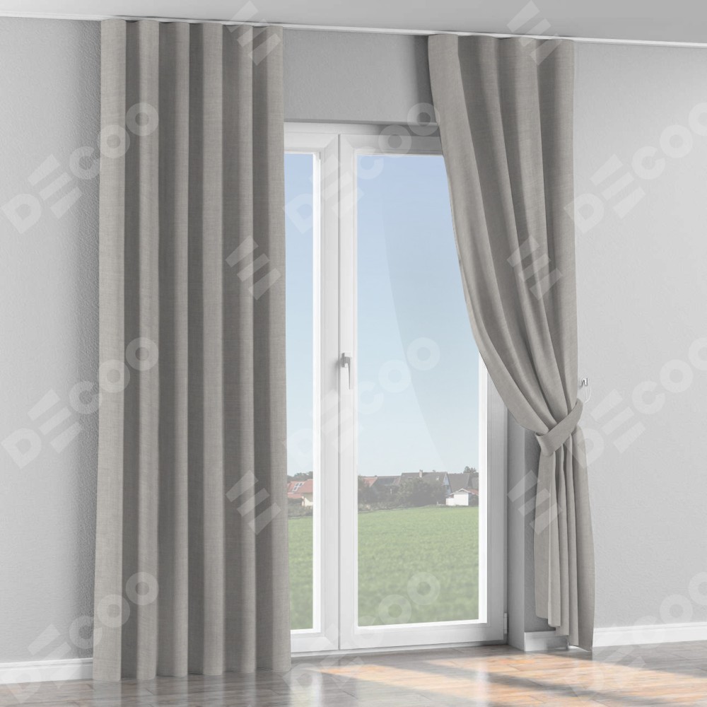 Комплект прямых штор, от производителя «Cortin», пошиты из ткани лён серый, артикул ткани 91410. С изнаночной стороны в верхней части штор пристрачивается шторная лента с декоративными складками «Волна». Для создания элегантных складок прямые шторы шьются по стандарту с коэффициентом 1:2 (на 100 см. ширины проёма 200 см. ширины ткани).