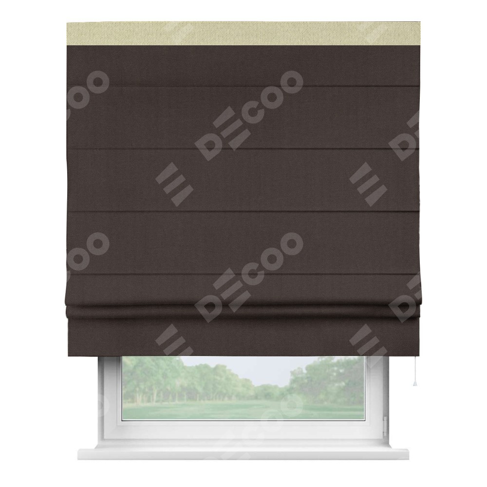 Римская штора пошита из ткани лён димаут венге, артикул: 91001, с отделкой кантом «Кинг» отличается своей необычной особенностью: кант располагается исключительно сверху шторы. Такой дизайн делает акцент на верхней части окна, визуально поднимая потолок и придавая интерьеру более возвышенный и изысканный вид. Отделка кантом на верхней кромке не только украшает штору, но и может служить дополнительной защитой от износа в месте наибольшего контакта с механизмом управления шторой.