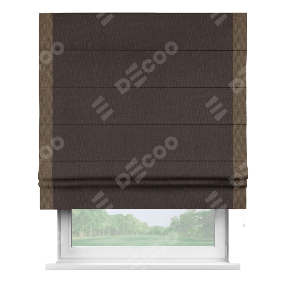 Римская штора пошита из ткани лён димаут венге, артикул: 91001, с отделкой кантом «Стрим Дуо» выделяется наличием кантов по обоим бокам шторы, слева и справа. Этот дизайн придает шторе аккуратный и завершенный вид, акцентируя вертикальные линии и визуально вытягивая окно в высоту. Отделка кантом по бокам не только украшает штору, но и служит практической функцией, укрепляя края и продлевая срок службы изделия.