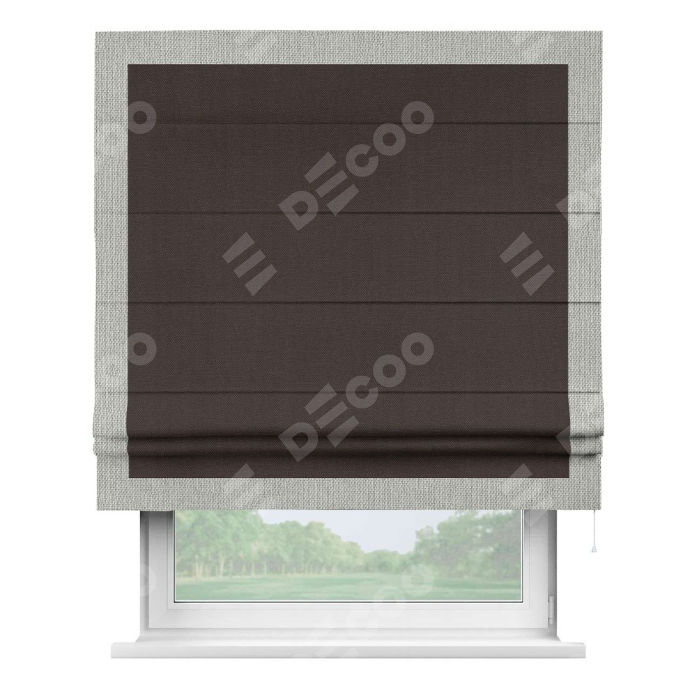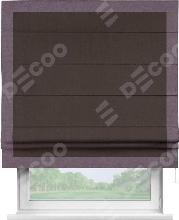 Римская штора пошита из ткани лён димаут венге, артикул: 91001, с отделкой кантом «Чесс» отличается своей уникальной деталью — наличием канта не только по бокам и снизу, но и сверху по всем краям шторы. Это придает шторе особенно аккуратный и завершенный вид, делая акцент на границах и форме шторы. Отделка кантом по всему периметру шторы усиливает её декоративные качества и подчеркивает строгую геометрию, что может быть особенно актуально для современных и минималистичных интерьеров.