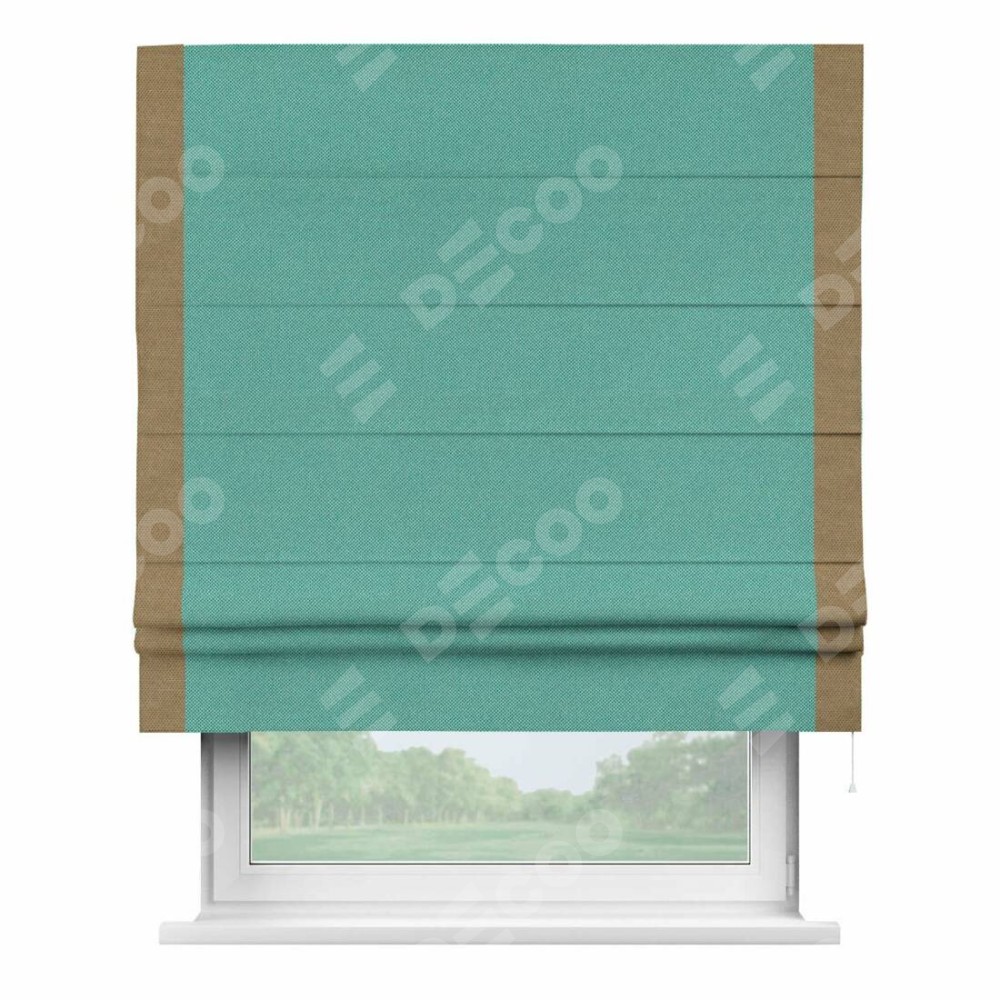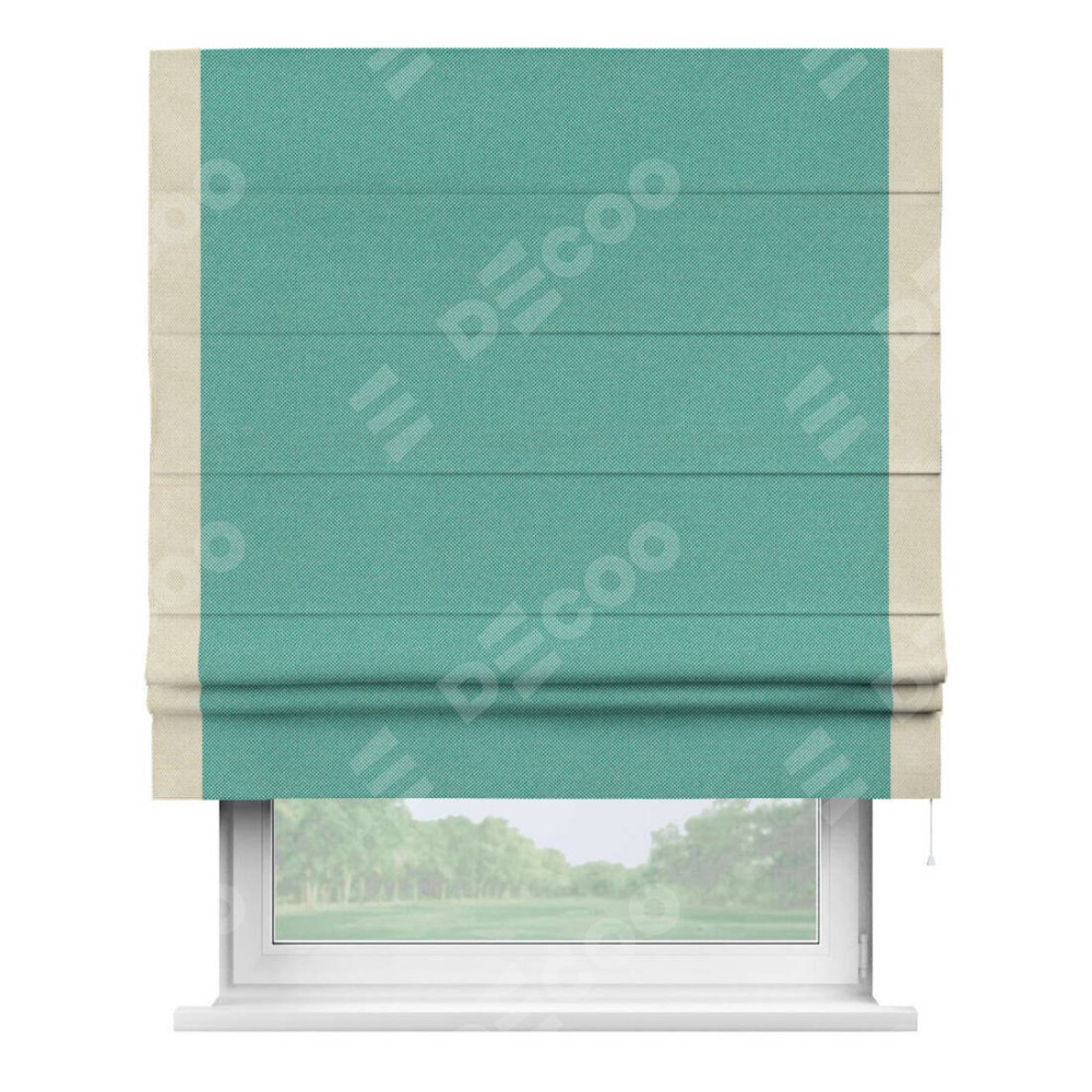 Римская штора производителя «Cortin», используется для проёма, пошита из ткани лён димаут бирюзовый, артикул 23. Отделка шторы кантом «Стрим Дуо», ткань для канта используется из льна димаут разной расцветки на выбор. Имеет универсальный механизм и подходит для монтажа: на потолок, на стену и в нишу.