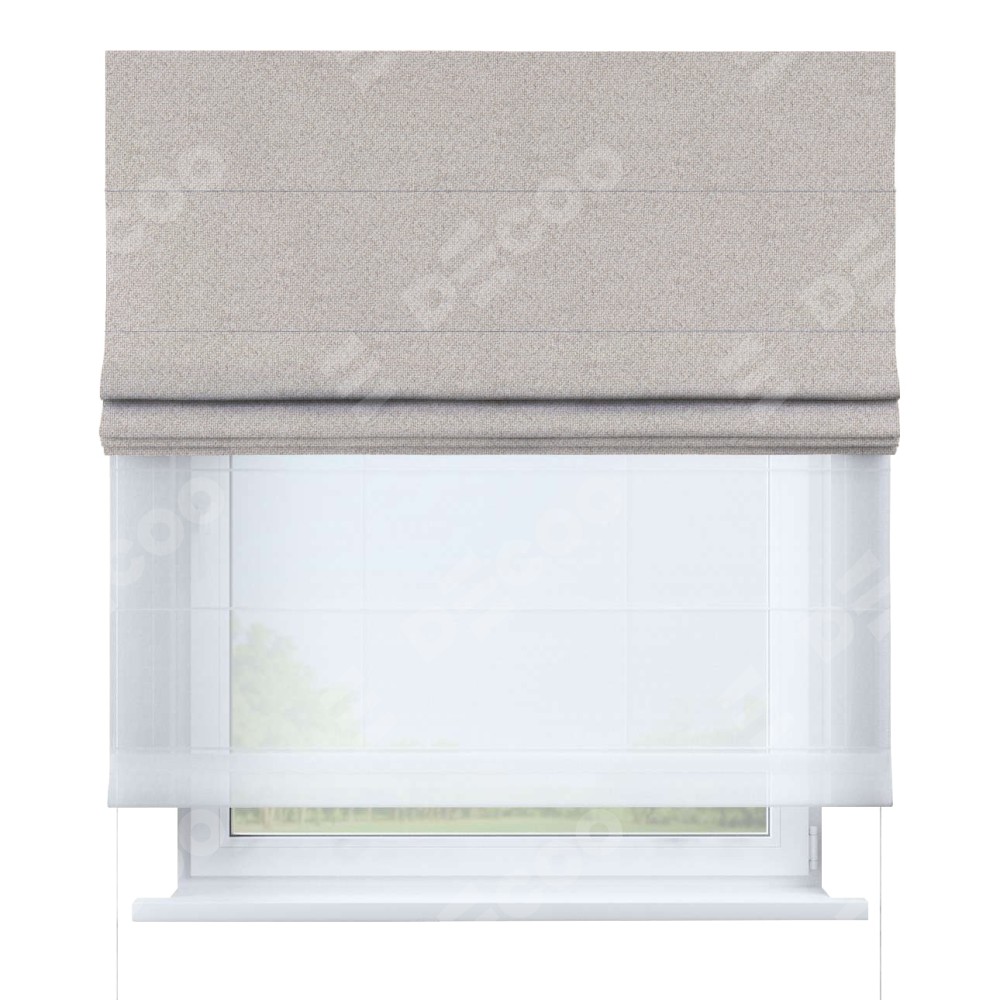 Двойная римская штора «День-ночь» от производителя Cortin предназначена для использования в проёмах. Эта штора уникальна тем, что состоит из двух полотен. На лицевой стороне находится лён димаут бежевый (артикул: 01), обеспечивающий эффективное затемнение. В комплект также входит вторая ткань — легкий белый тюль (артикул: V-01), который добавляет изящества и легкости оформлению окна. Кроме того, доступны и другие разновидности ткани тюль, выбор которых доступен по  ссылке .