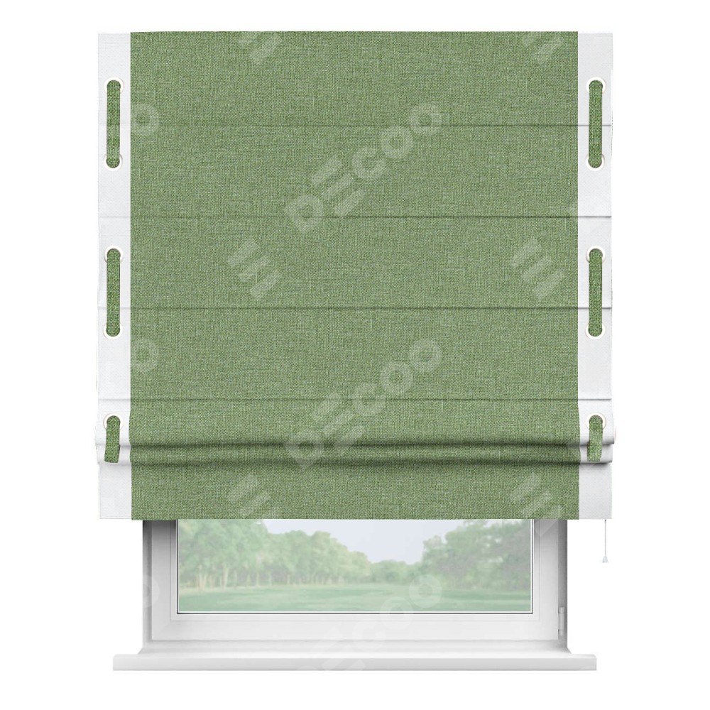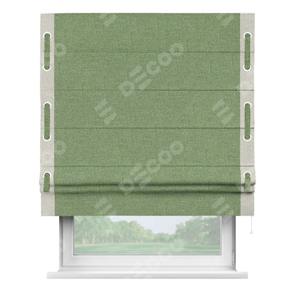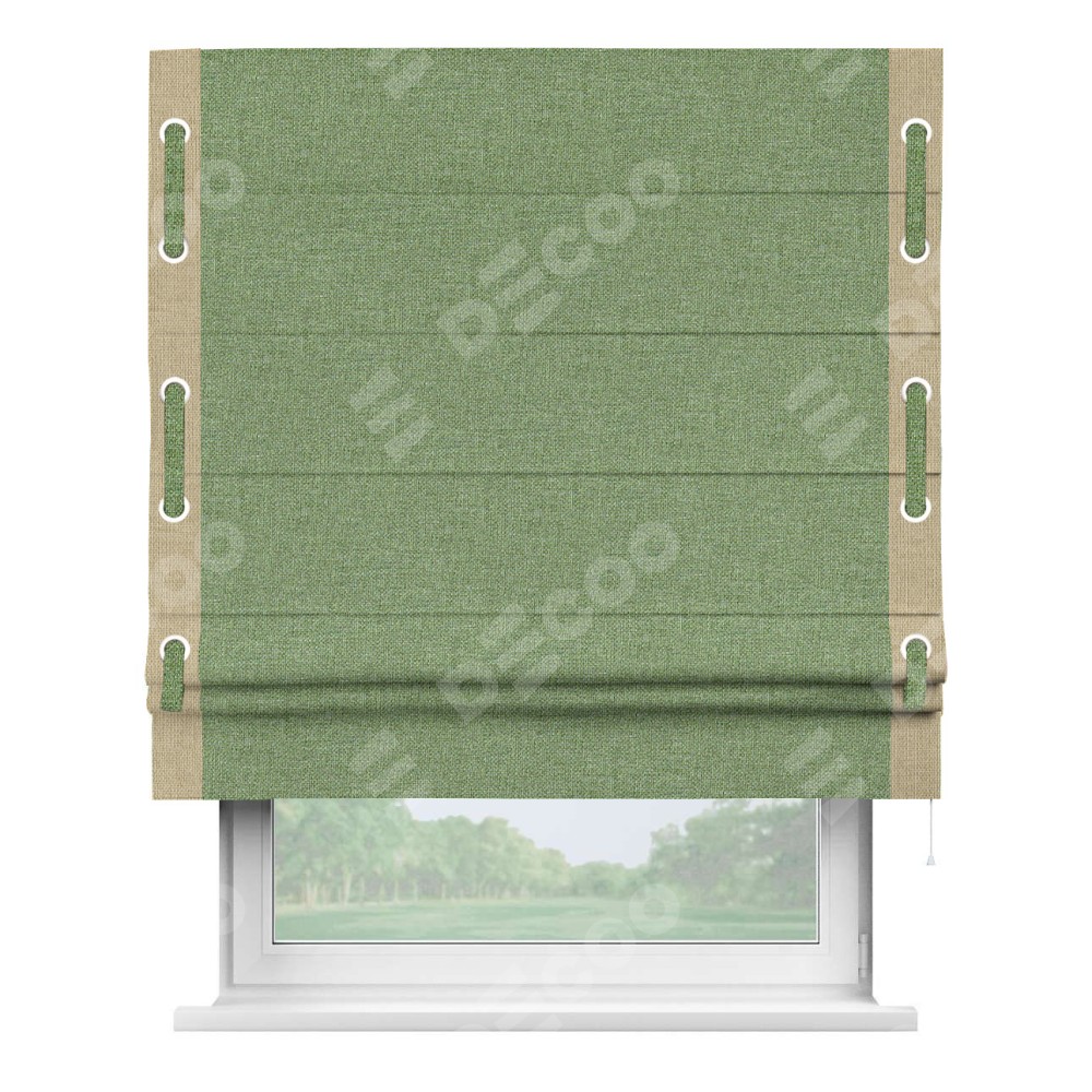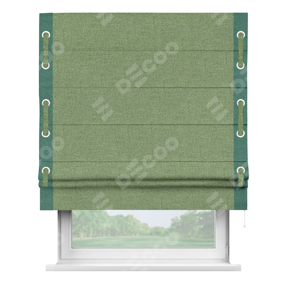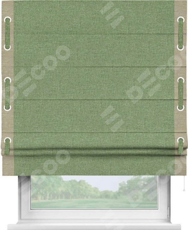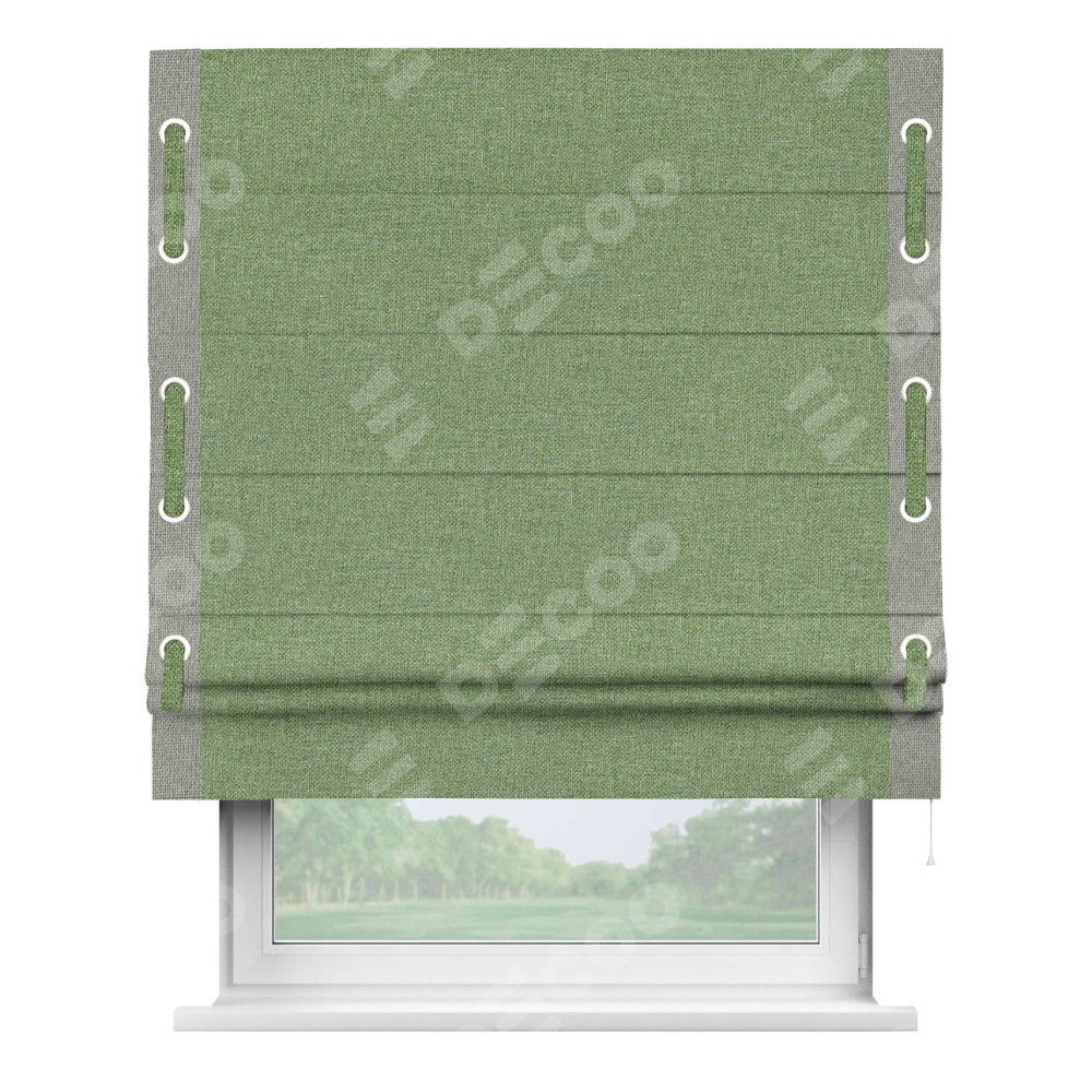 Римская штора «Cortin» для проёма, лён димаут светло-салатовый с кантом Стрим Дуо (люверсы с пояском)
