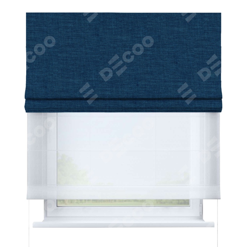 Двойная римская штора «День-ночь» от производителя Cortin предназначена для использования в проёмах. Эта штора уникальна тем, что состоит из двух полотен. На лицевой стороне находится лён синий (артикул: 104496), обеспечивающий эффективное затемнение. В комплект также входит вторая ткань — легкий белый тюль (артикул: V-01), который добавляет изящества и легкости оформлению окна. Кроме того, доступны и другие разновидности ткани тюль, выбор которых доступен по  ссылке .