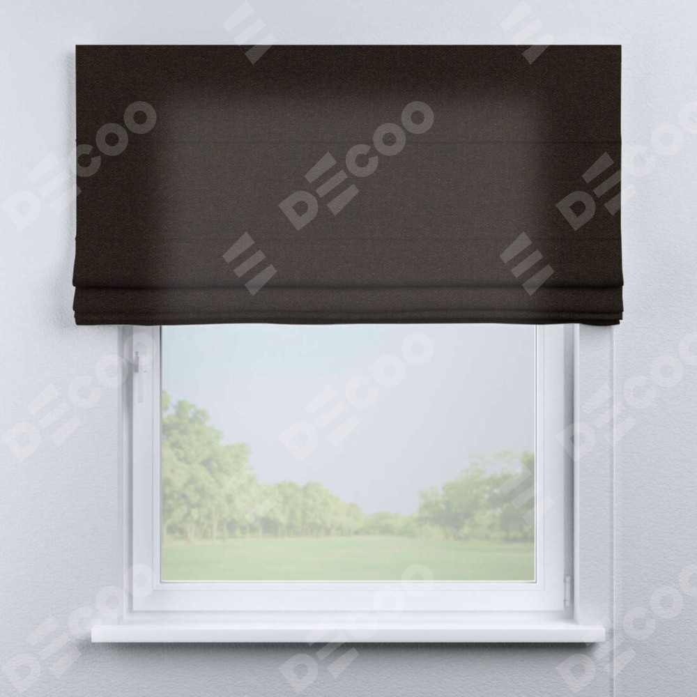 Классическая римская штора производителя «Cortin», пошита из ткани лён тёмно-коричневый, артикул: 104497. Имеет универсальный механизм и подходит для монтажа: на потолок, на стену и в нишу.