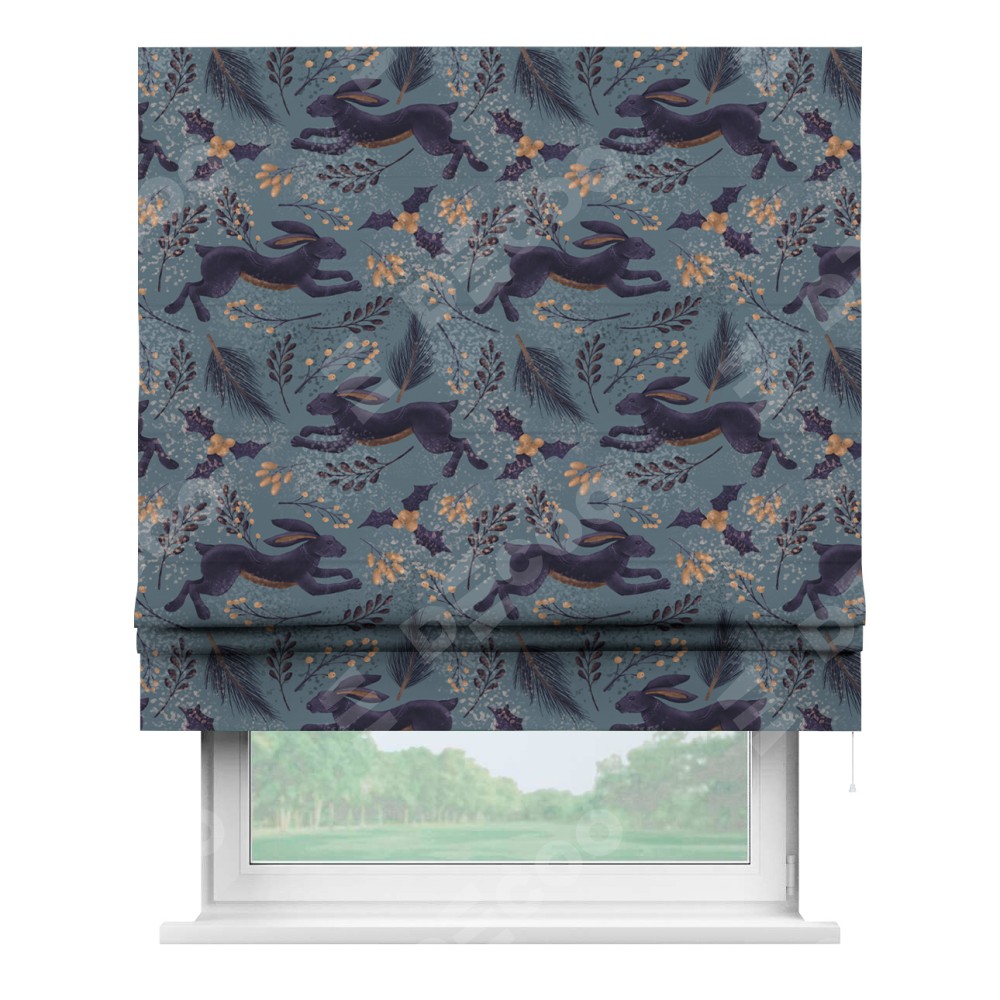 Классическая римская штора производителя «Cortin», пошита из ткани дарк арт зайцы, артикул:. Имеет универсальный механизм и подходит для монтажа: на потолок, на стену и в нишу.