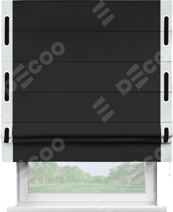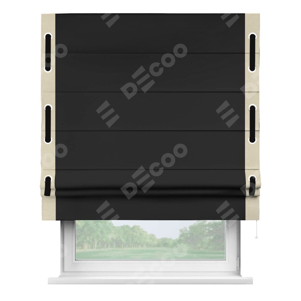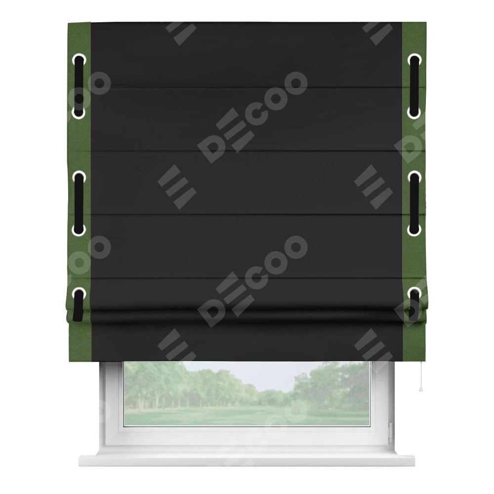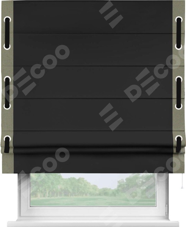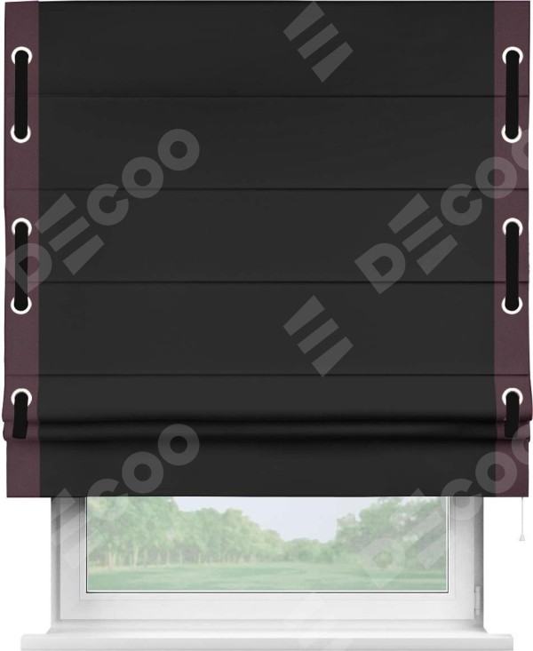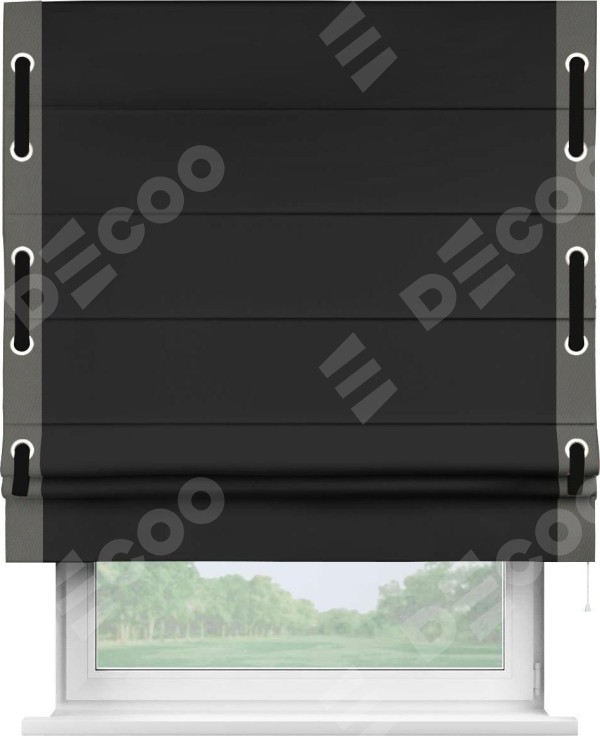Римская штора «Cortin» для проёма, блэкаут однотонный черный с кантом Стрим Дуо (люверсы с пояском)
