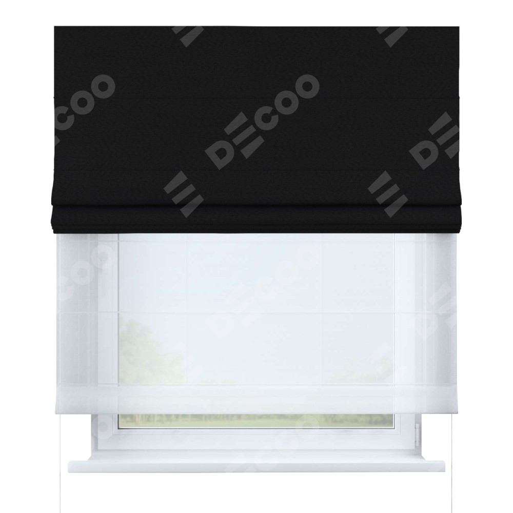 Двойная римская штора «День-ночь» от производителя Cortin предназначена для использования в проёмах. Эта штора уникальна тем, что состоит из двух полотен. На лицевой стороне находится лён рустик черный (артикул: 145313), обеспечивающий эффективное затемнение. В комплект также входит вторая ткань — легкий белый тюль (артикул: V-01), который добавляет изящества и легкости оформлению окна. Кроме того, доступны и другие разновидности ткани тюль, выбор которых доступен по  ссылке .