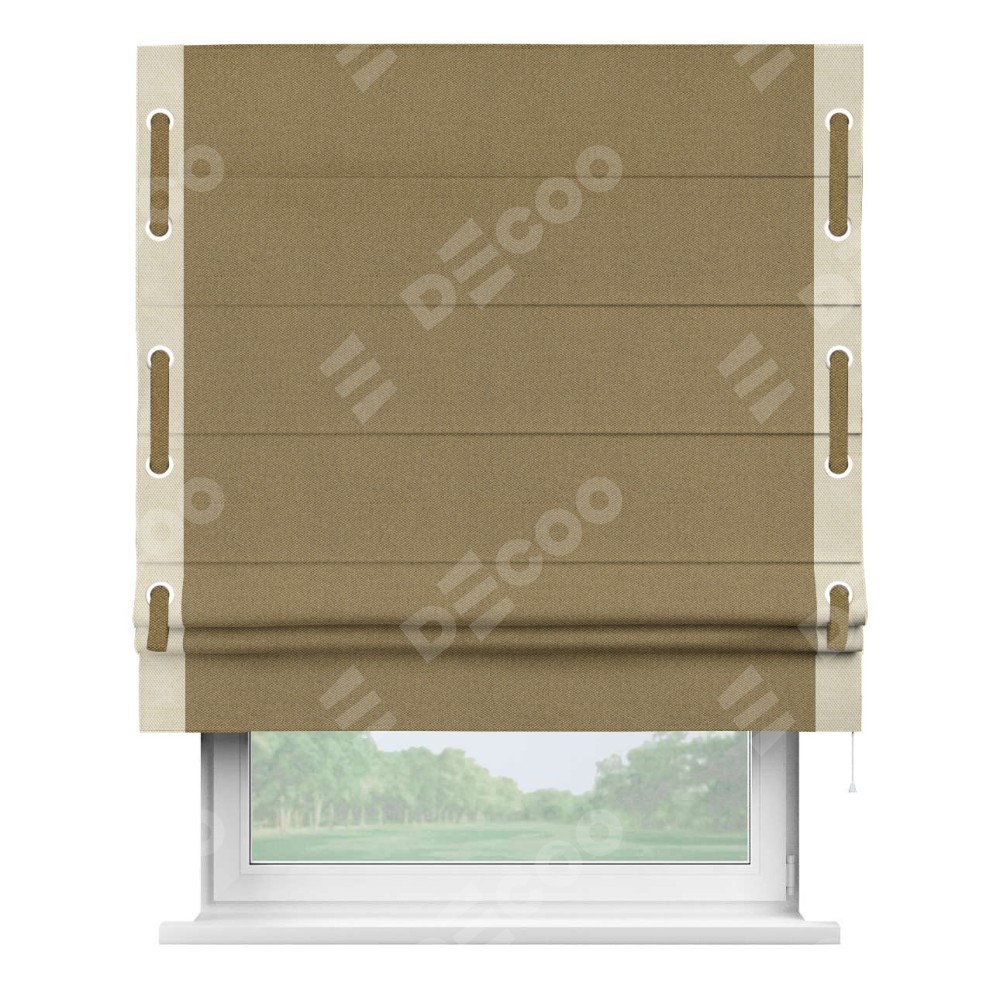 Римская штора производителя «Cortin», используется для проёма, пошита из ткани лён димаут оливковый, артикул 16243. Отделка шторы кантом «Стрим Дуо» на кантах расположены люверсы с пояском, ткань для канта используется лён димаут разной расцветки на выбор. Ткань для пояска обычно используется из основной ткани шторы, а так же можно сделать из любой расцветки по желанию. Имеет универсальный механизм и подходит для монтажа: на потолок, на стену и в нишу.