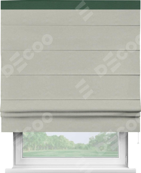Римская штора производителя «Cortin», используется для проёма, пошита из ткани лён димаут светло-серый, артикул 83025. Отделка шторы кантом «Кинг», ткань для канта используется из льна димаут разной расцветки на выбор. Имеет универсальный механизм и подходит для монтажа: на потолок, на стену и в нишу.