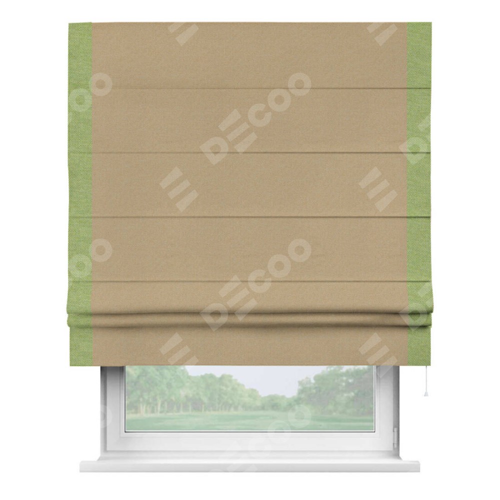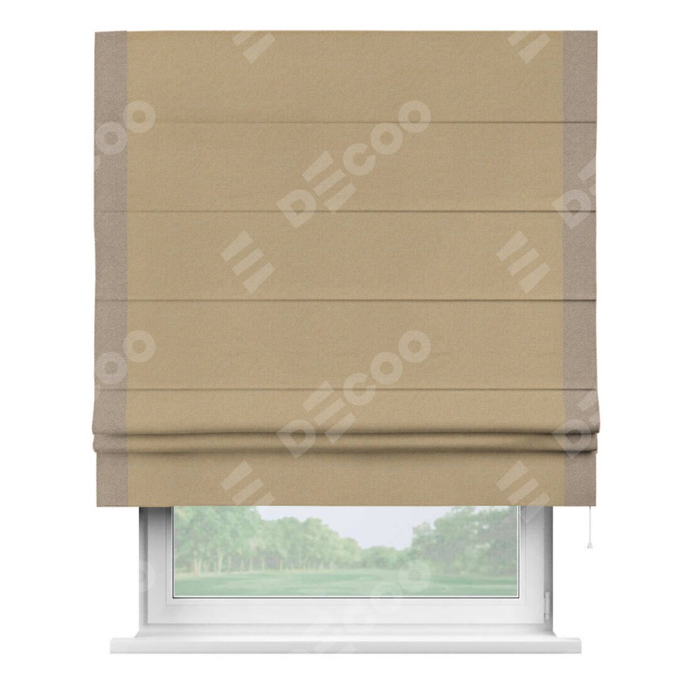 Римская штора производителя «Cortin», используется для проёма, пошита из ткани лён димаут тёмно-бежевый, артикул 83037. Отделка шторы кантом «Стрим Дуо», ткань для канта используется из льна димаут разной расцветки на выбор. Имеет универсальный механизм и подходит для монтажа: на потолок, на стену и в нишу.