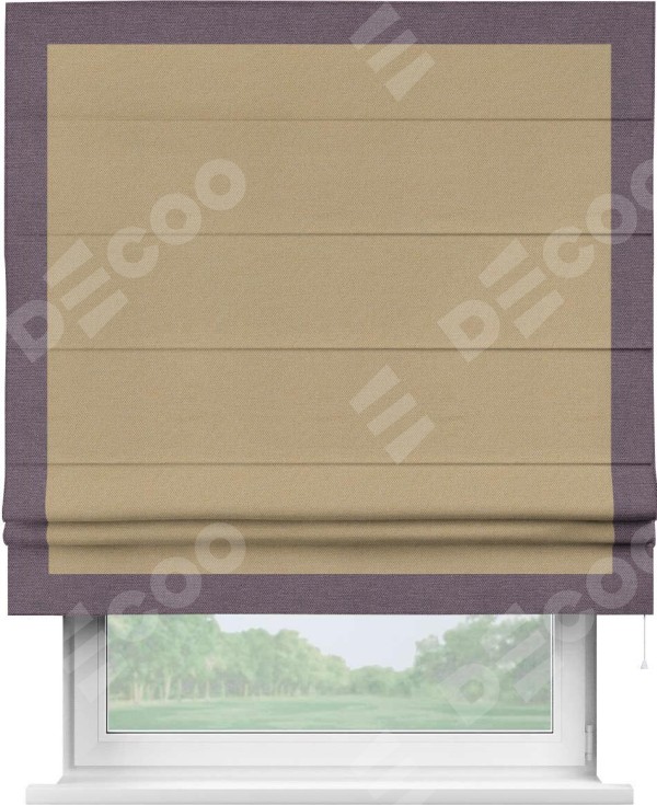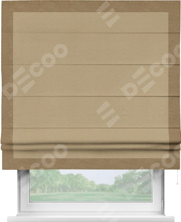 Римская штора производителя «Cortin», используется для проёма, пошита из ткани лён димаут тёмно-бежевый, артикул 83037. Отделка шторы кантом «Чесс», ткань для канта используется из льна димаут разной расцветки на выбор. Имеет универсальный механизм и подходит для монтажа: на потолок, на стену и в нишу.