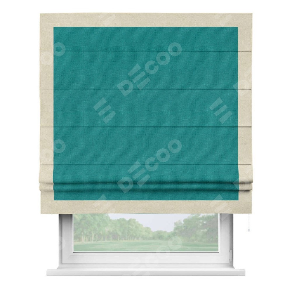 Римская штора производителя «Cortin», используется для проёма, пошита из ткани лён димаут тёмно-бирюзовый, артикул 318. Отделка шторы кантом «Чесс», ткань для канта используется из льна димаут разной расцветки на выбор. Имеет универсальный механизм и подходит для монтажа: на потолок, на стену и в нишу.