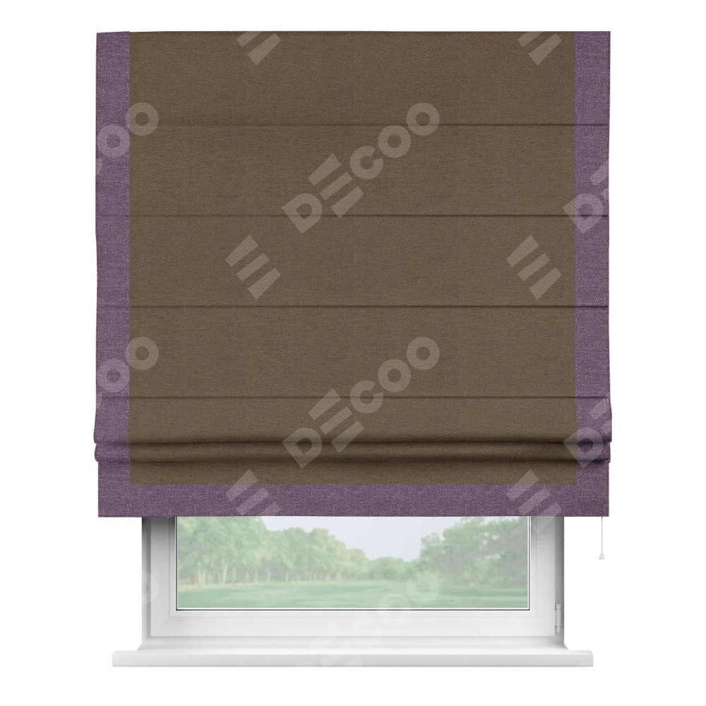 Римская штора производителя «Cortin», используется для проёма, пошита из ткани лён димаут тёмно-коричневый, артикул 83030. Отделка шторы кантом «Виктория», ткань для канта используется из льна димаут разной расцветки на выбор. Имеет универсальный механизм и подходит для монтажа: на потолок, на стену и в нишу.