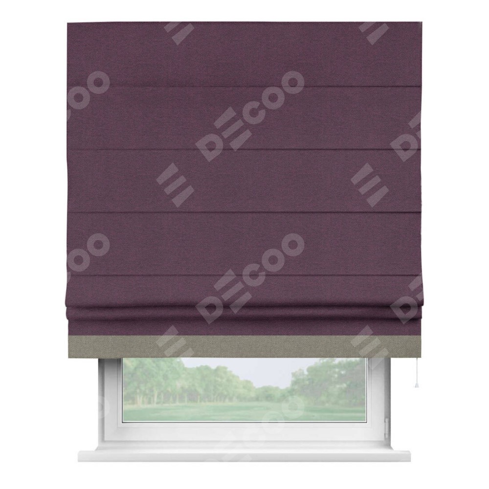 Римская штора производителя «Cortin», используется для проёма, пошита из ткани лён димаут фиолетовый, артикул 8817. Отделка шторы кантом «Джестер», ткань для канта используется из льна димаут разной расцветки на выбор. Имеет универсальный механизм и подходит для монтажа: на потолок, на стену и в нишу.