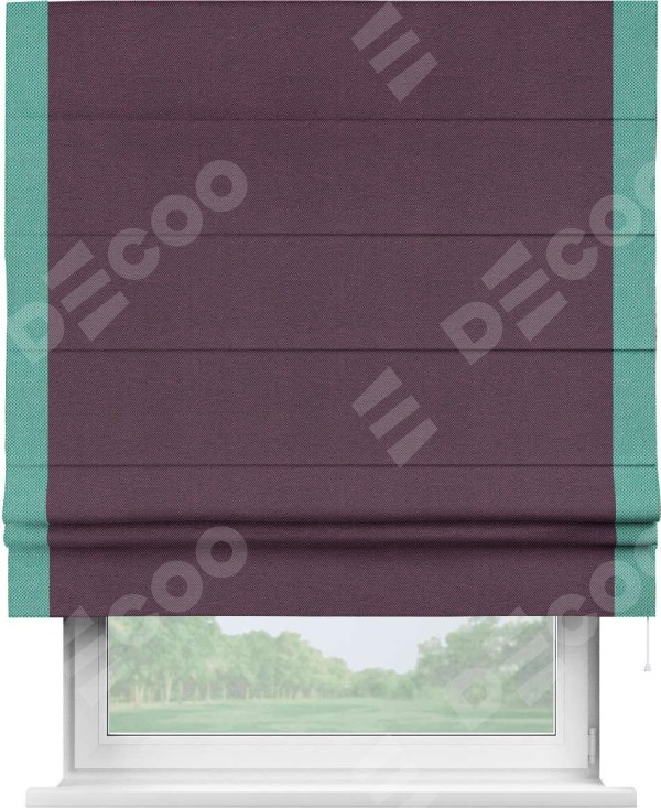 Римская штора производителя «Cortin», используется для проёма, пошита из ткани лён димаут фиолетовый, артикул 8817. Отделка шторы кантом «Стрим Дуо», ткань для канта используется из льна димаут разной расцветки на выбор. Имеет универсальный механизм и подходит для монтажа: на потолок, на стену и в нишу.