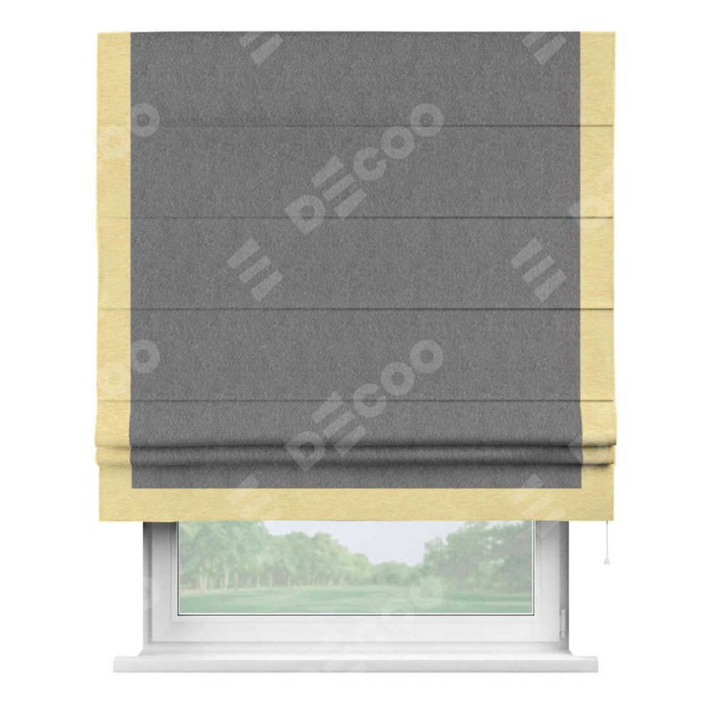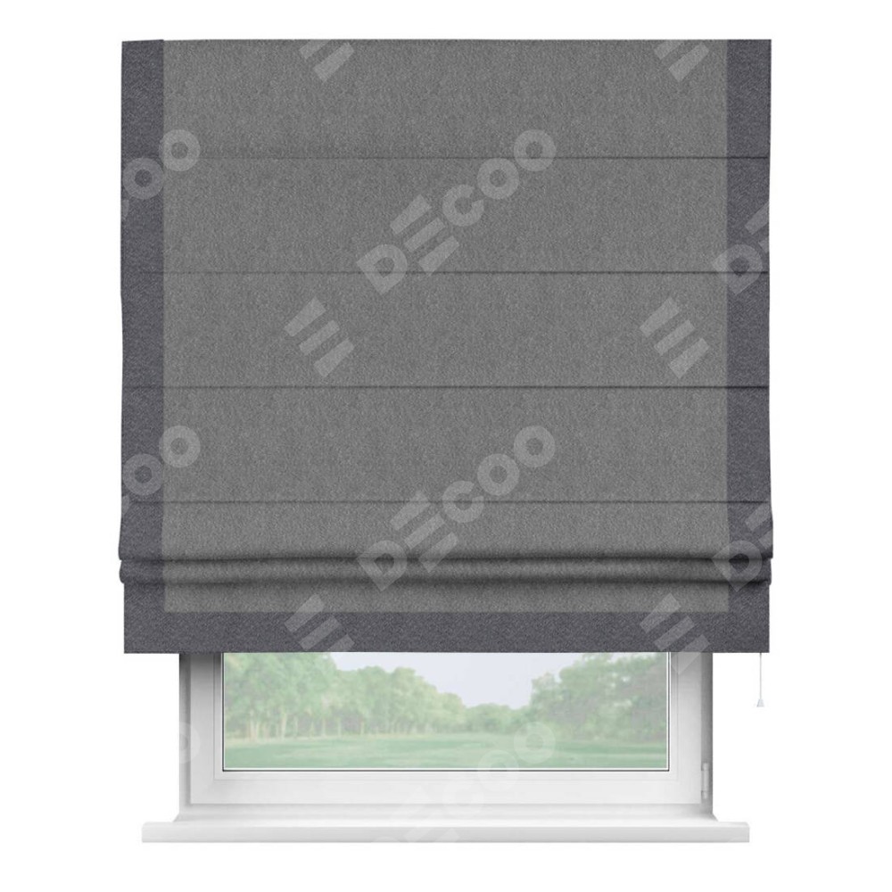 Римская штора производителя «Cortin», используется для проёма, пошита из ткани софт однотонный серый, артикул 70605. Отделка шторы кантом «Виктория», ткань для канта используется из софта разной расцветки на выбор. Имеет универсальный механизм и подходит для монтажа: на потолок, на стену и в нишу.