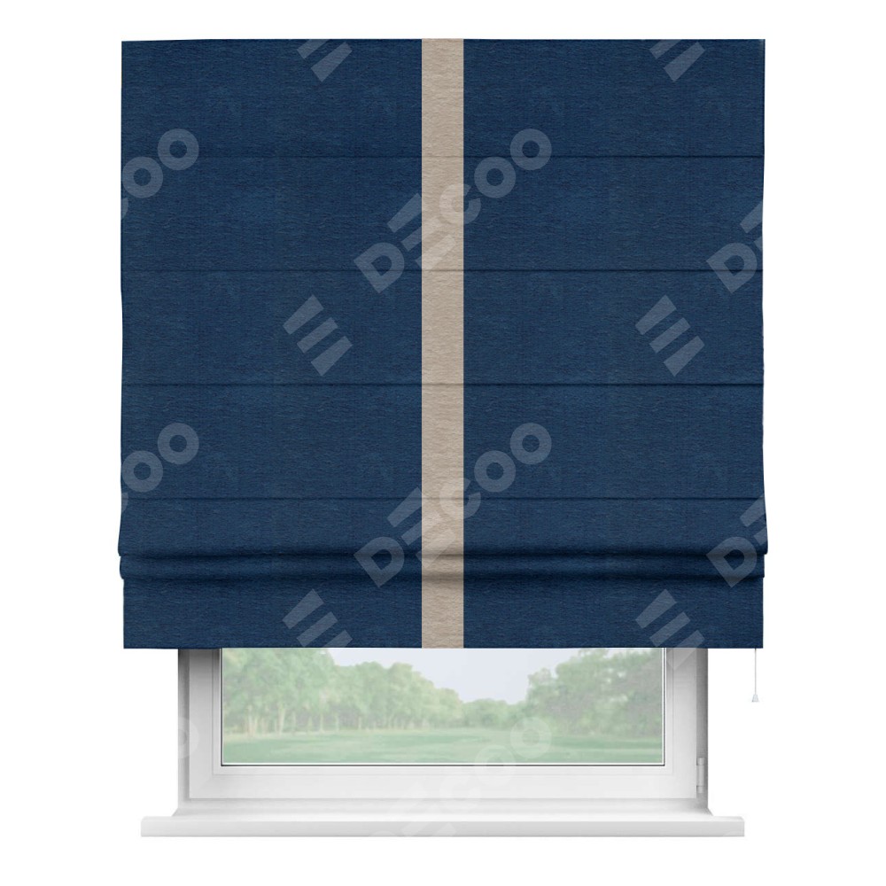 Римская штора производителя «Cortin», используется для проёма, пошита из ткани софт однотонный синий, артикул 42937. Отделка шторы кантом «Хайвэй», ткань для канта используется из софта разной расцветки на выбор. Имеет универсальный механизм и подходит для монтажа: на потолок, на стену и в нишу.