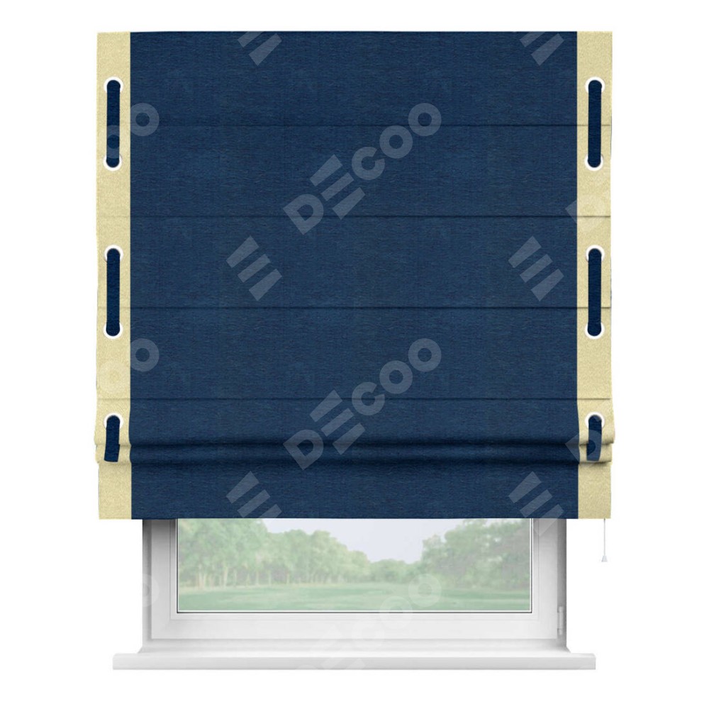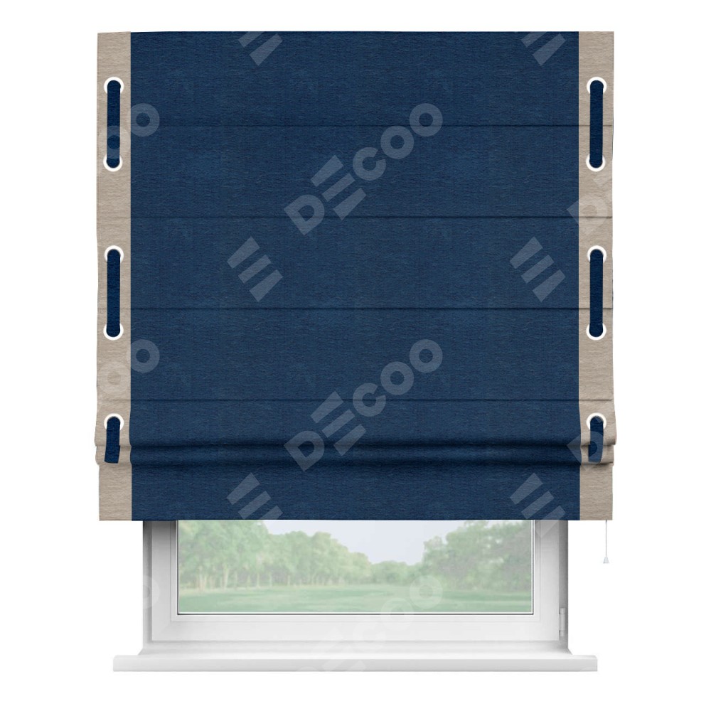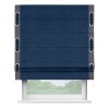 Римская штора производителя «Cortin», используется для проёма, пошита из ткани софт однотонный синий, артикул 42937. Отделка шторы кантом «Стрим Дуо» на кантах расположены люверсы с пояском, ткань для канта используется из софта разной расцветки на выбор. Ткань для пояска обычно используется из основной ткани шторы, а так же можно сделать из любой расцветки по желанию. Имеет универсальный механизм и подходит для монтажа: на потолок, на стену и в нишу.
