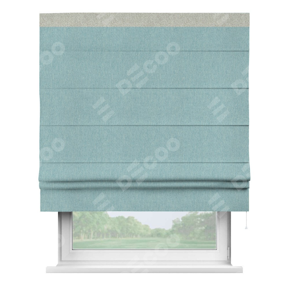 Римская штора производителя «Cortin», используется для проёма, пошита из ткани твид блэкаут небесно-голубой, артикул 21578. Отделка шторы кантом «Кинг», ткань для канта используется из твида разной расцветки на выбор. Имеет универсальный механизм и подходит для монтажа: на потолок, на стену и в нишу.