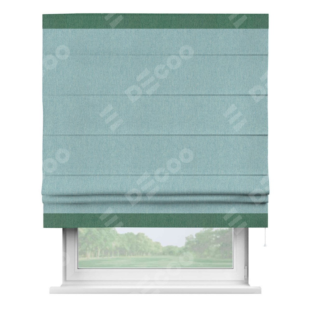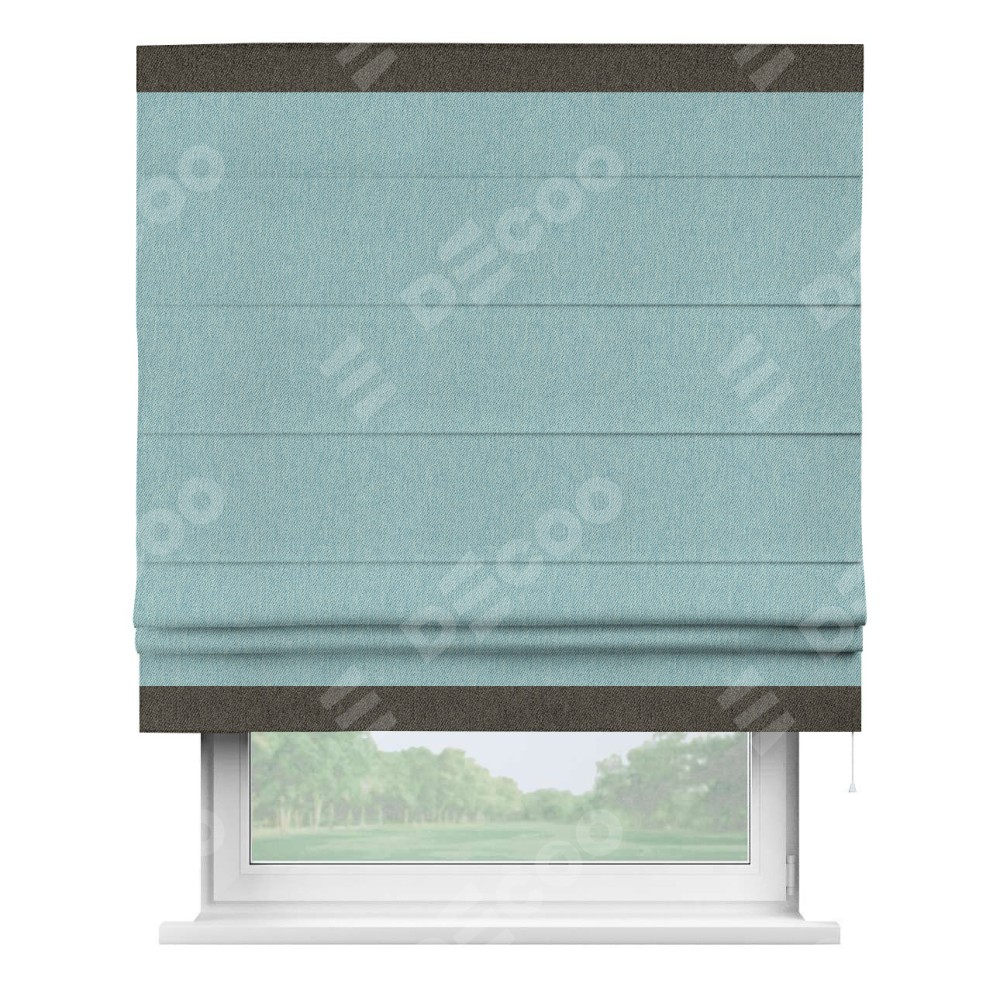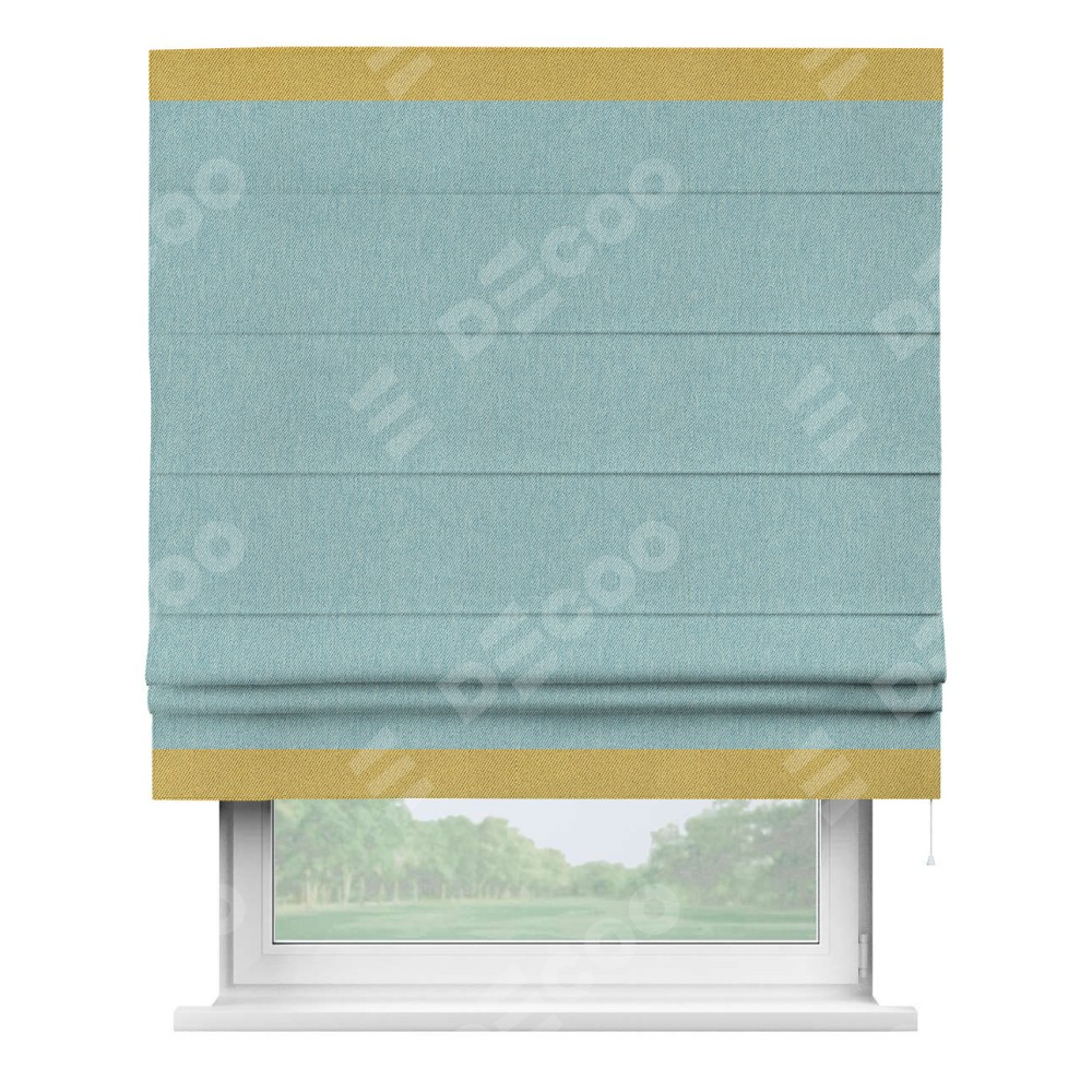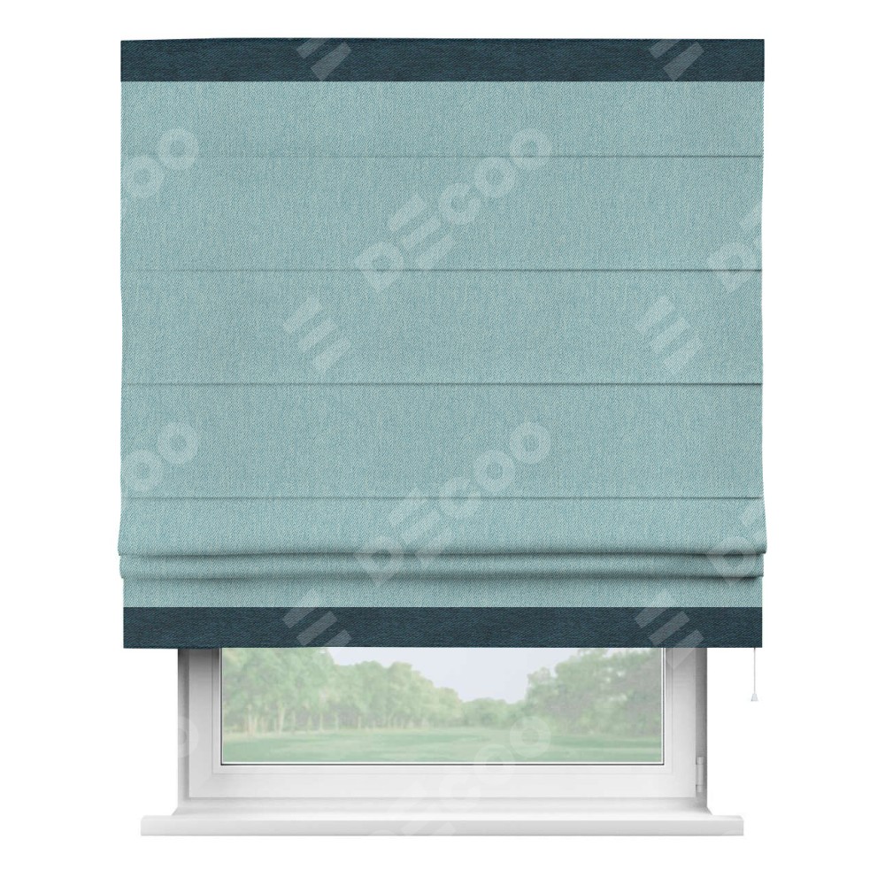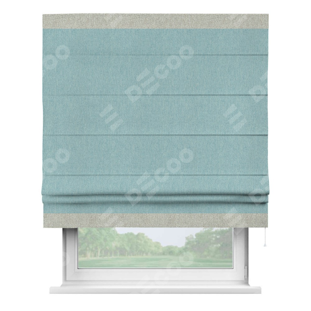 Римская штора производителя «Cortin», используется для проёма, пошита из ткани твид блэкаут небесно-голубой, артикул 21578. Отделка шторы кантом «Горизонт», ткань для канта используется из твида разной расцветки на выбор. Имеет универсальный механизм и подходит для монтажа: на потолок, на стену и в нишу.