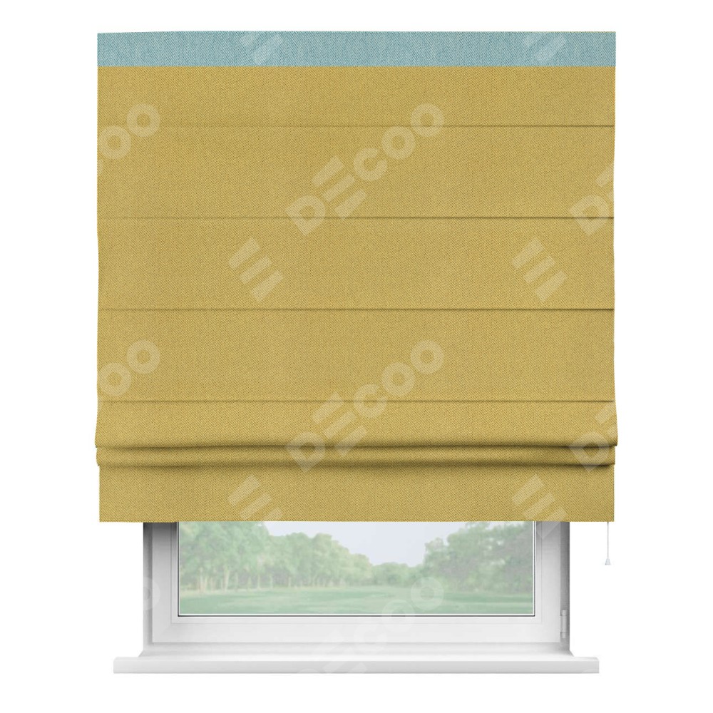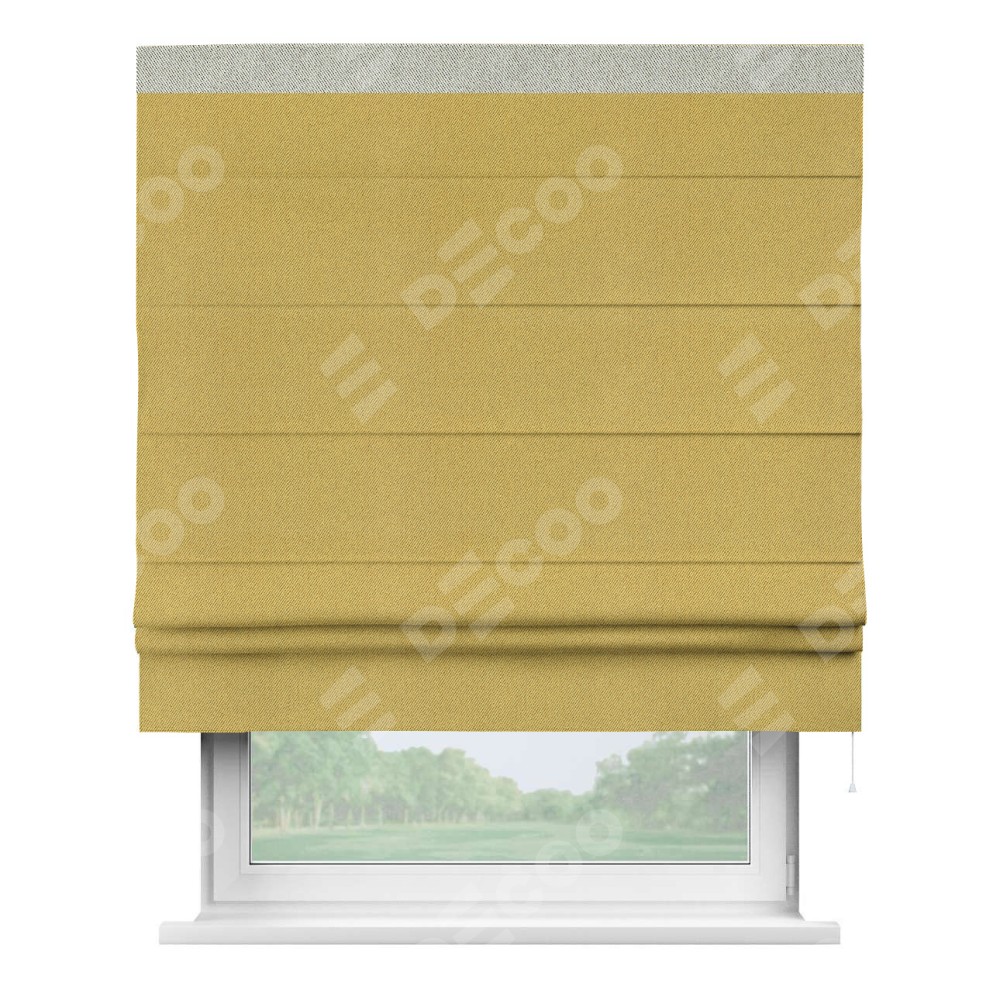 Римская штора производителя «Cortin», используется для проёма, пошита из ткани твид блэкаут пыльная горчица, артикул 21588. Отделка шторы кантом «Кинг», ткань для канта используется из твида разной расцветки на выбор. Имеет универсальный механизм и подходит для монтажа: на потолок, на стену и в нишу.