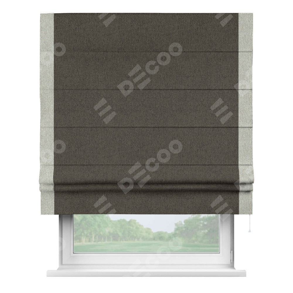 Римская штора производителя «Cortin», используется для проёма, пошита из ткани твид блэкаут тёмно-коричневый, артикул 21584. Отделка шторы кантом «Стрим Дуо», ткань для канта используется из твида разной расцветки на выбор. Имеет универсальный механизм и подходит для монтажа: на потолок, на стену и в нишу.
