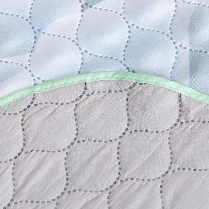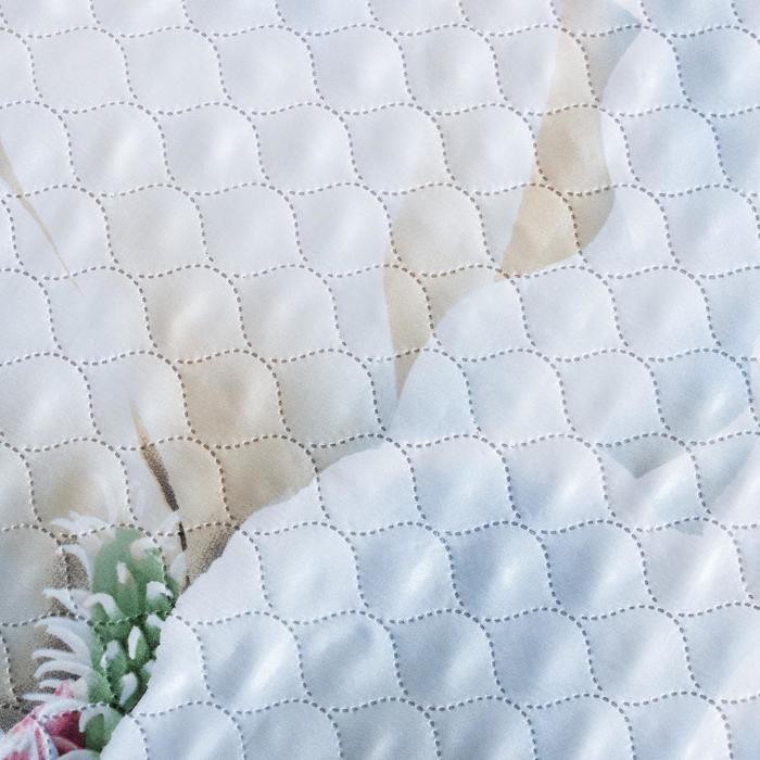 Характеристики: Ткань искусственный шелк, плотность 107 гр/м2, активное (стойкое) крашение. Верх покрывала — набивной рисунок в виде панно, низ — однотонная ткань. Края обработаны шелковой бейкой, упаковка прозрачный чемодан ПВХ с большим вкладышем.