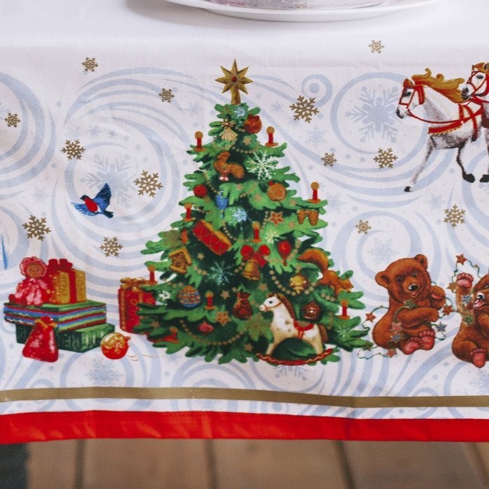 Скатерть украсит праздничный интерьер. Изделия с эксклюзивным принтом сшито из хлопкового полотна. Этот материал имеет плотную и упругую структуру, обладает высокой прочностью и на ура справляется с первостепенными задачами: