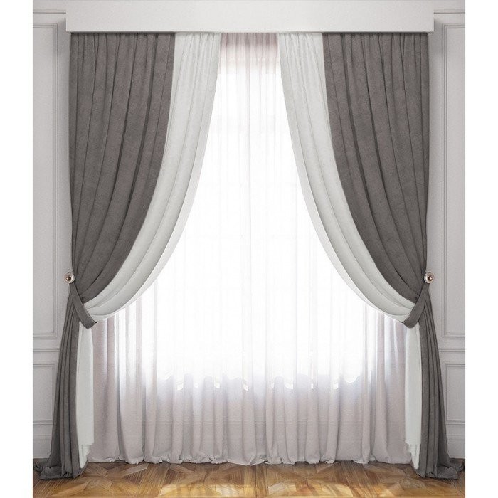 Комбинированные портьеры выполнены из плотной и бархатистой ткани софт. Этот материал надолго сохраняет внешний вид, хорошо пропускает воздух и удерживает свет.
