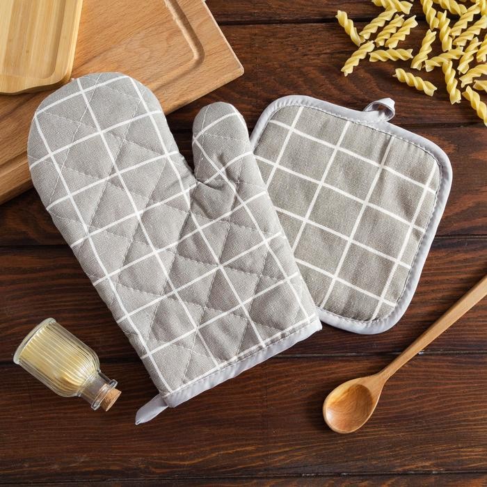 Кухонный набор Доляна «Клетка» цв.серый, прихватка 17*17 см, рукавица 26*16 см,100% п/э